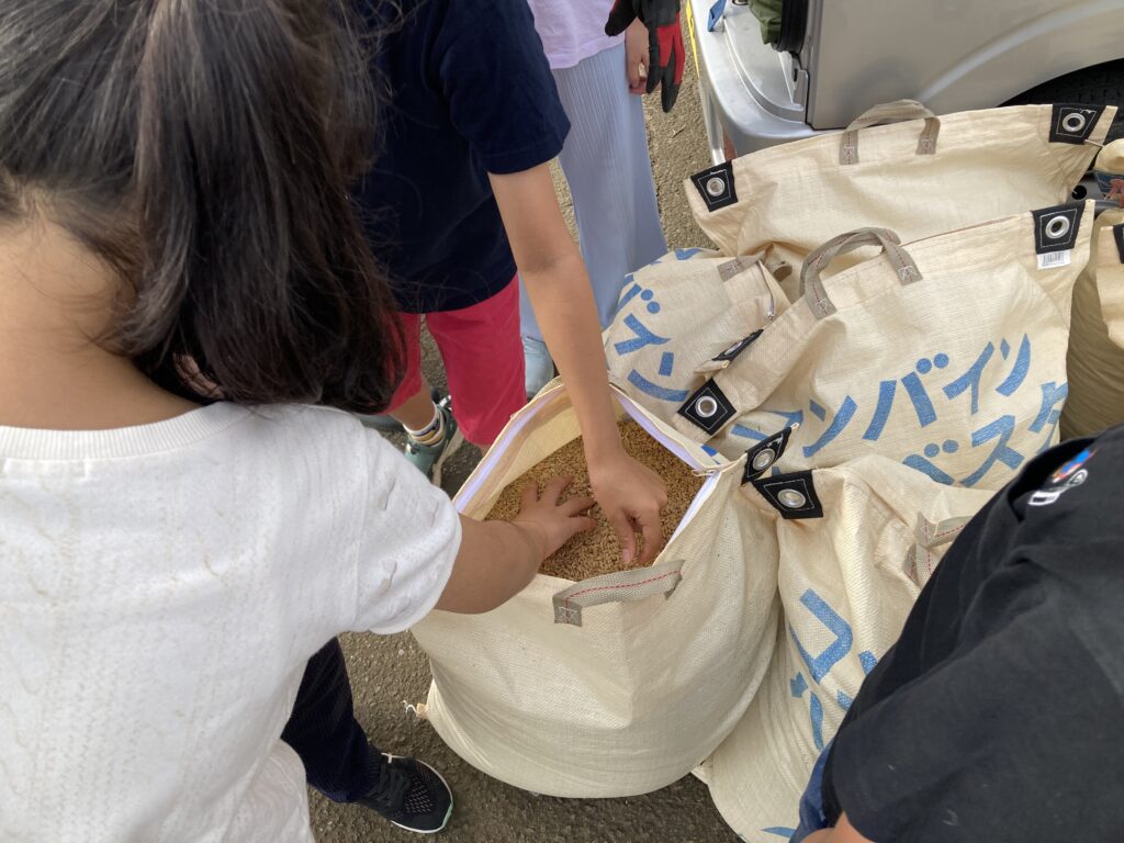 北斗校から歩いて田んぼに到着後、まず脱穀済みの米をみんなで見てみました。