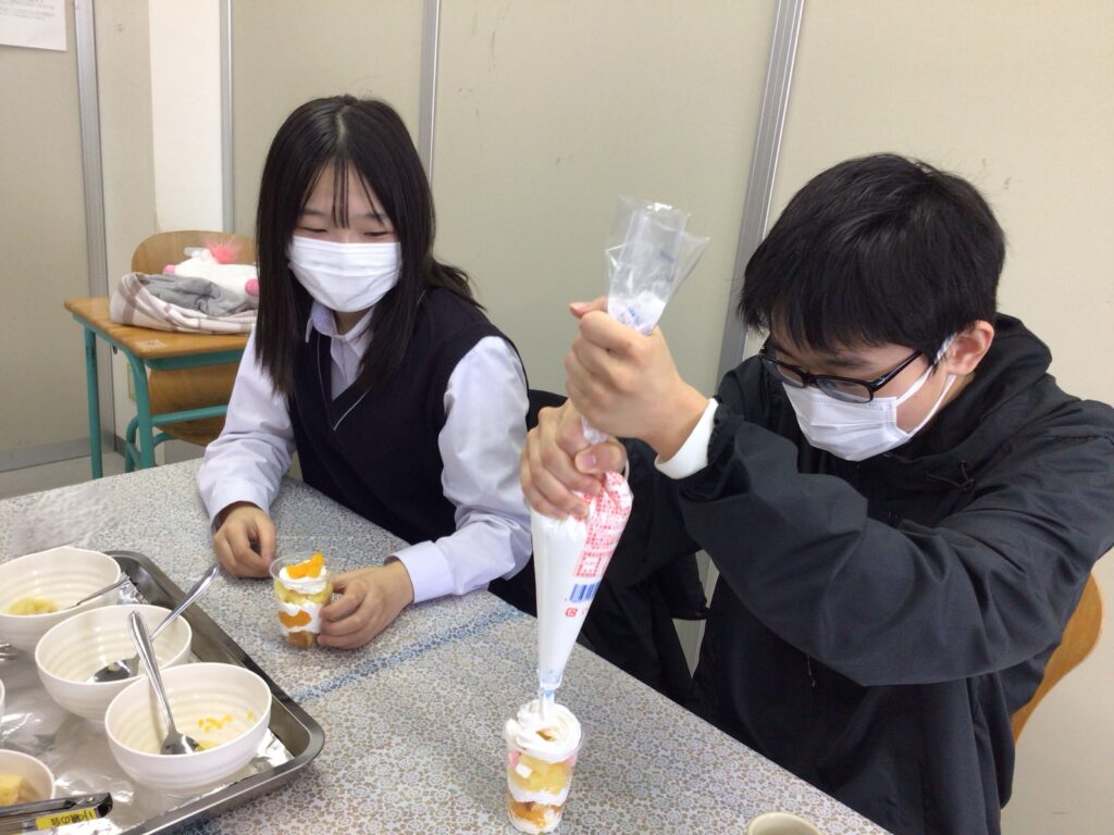 生徒のみなさんは思い思いにカップに果物やスポンジケーキを入れて、映えを追求していました。