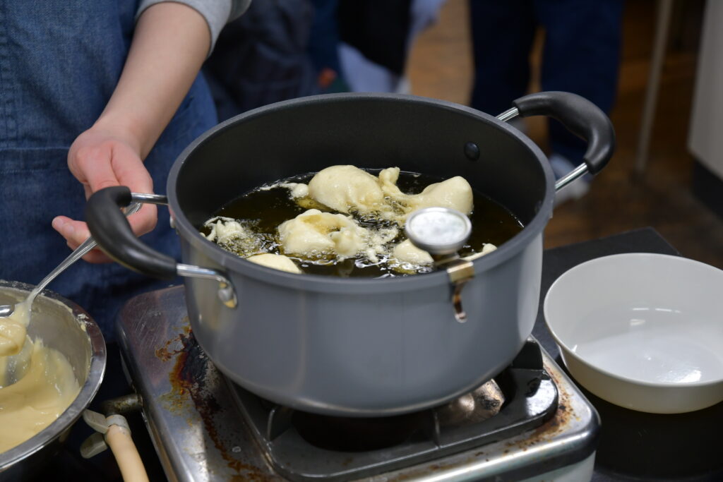 みんなが協力してまぜまぜした生地を揚げます!