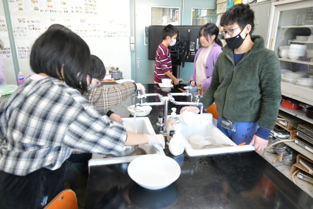 後片付けも班で協力して行いました。片付けの合言葉は「料理する前よりも美しく」です。