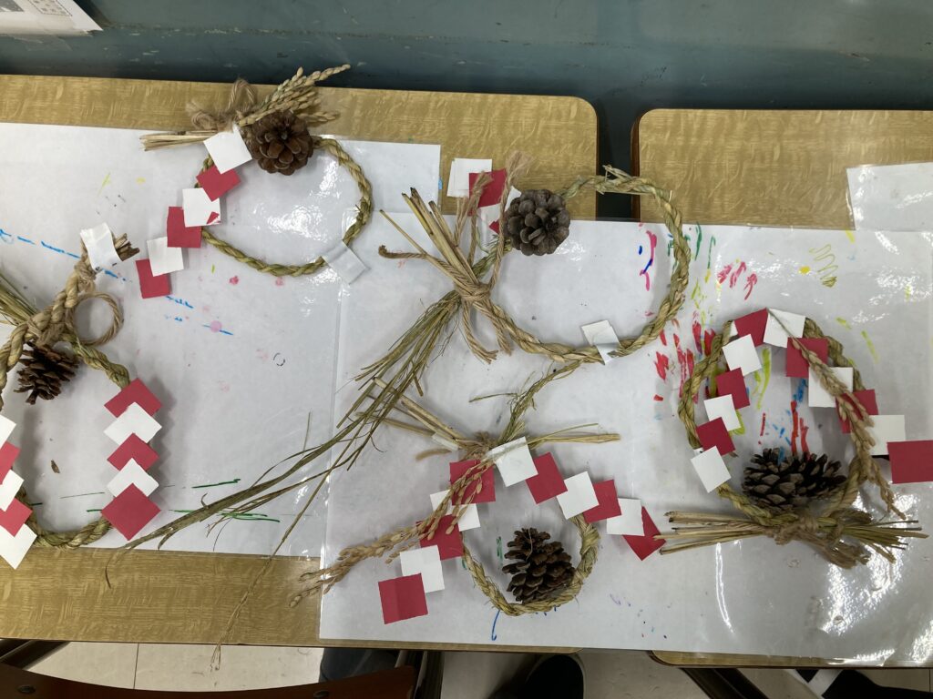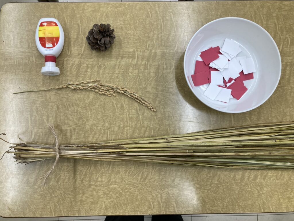 藁、麻ひもが必須です。飾りで松ぼっくり、紅白色画用紙、稲穂をつけると華やかになります!