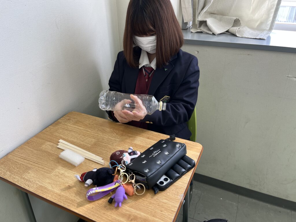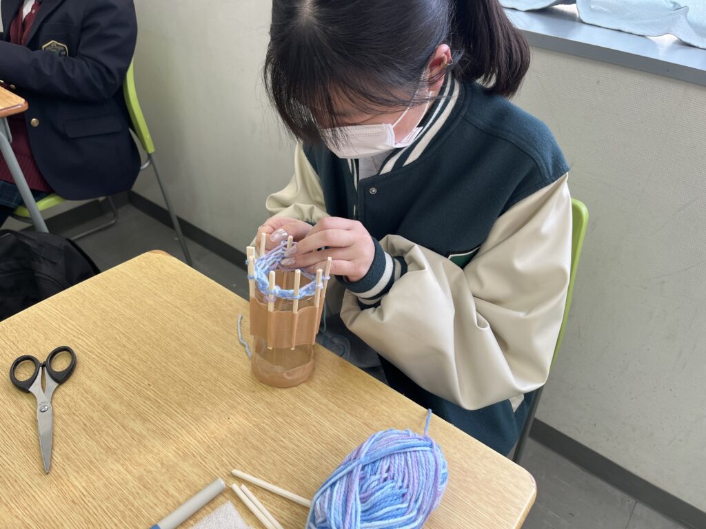 ペットボトルと割りばしで作った編み機を使って、毛糸を編みました。